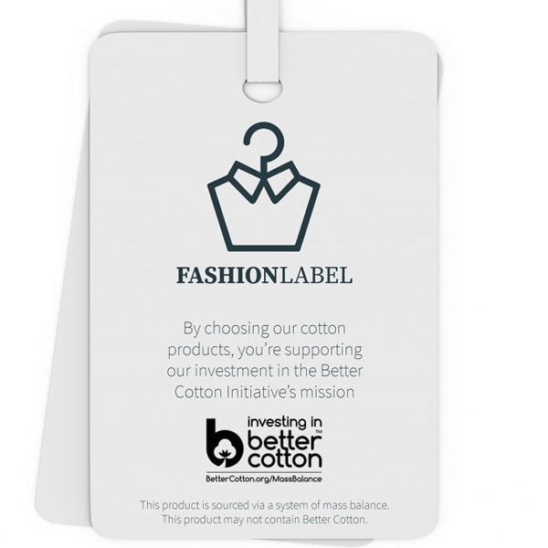 Better Cotton Initiative certified printed labels supporting sustainable cotton farming practices.